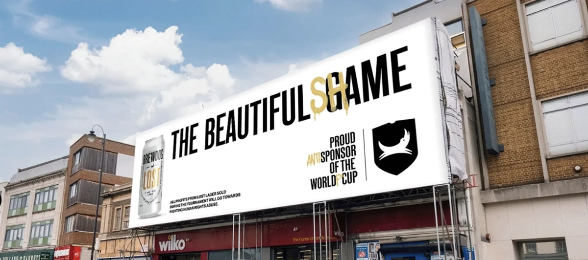 BrewDog, "fier anti-sponsor de la Coupe du Monde". La typographie agressive, le ton provocateur : tout traduit un seul positionnement, la rupture avec les codes de l'industrie brassicole.