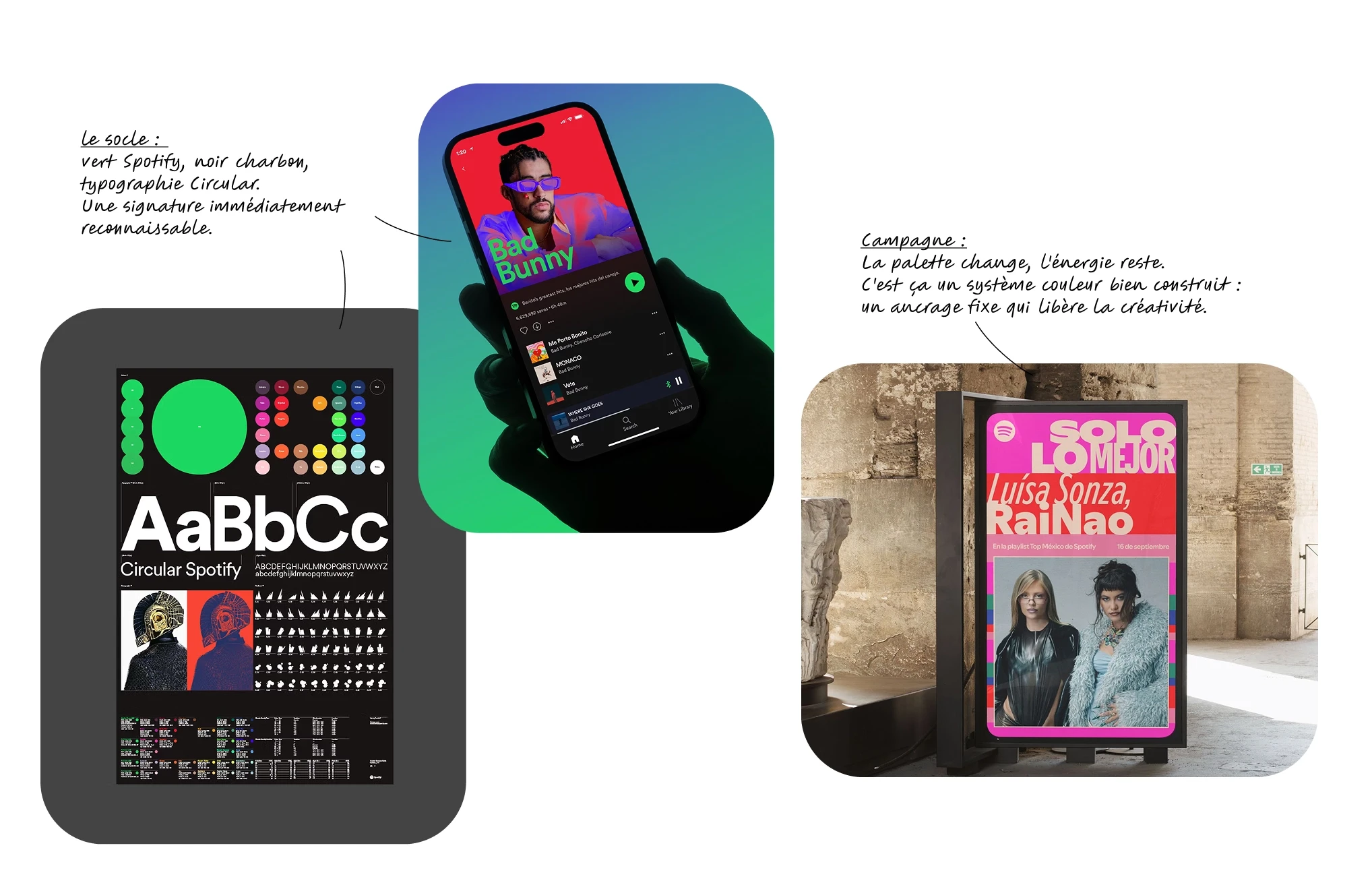 Dans l'univers tech, le bleu domine. Il signale la confiance, la fiabilité, le sérieux. Spotify a fait un choix radicalement différent : un vert électrique, délibérément vibrant, qui tranche avec tous les codes de la catégorie. Ce vert, associé au noir charbon et au blanc, constitue le socle de l'identité : l'application, le logo, les interfaces. Pour la communication, Spotify crée des palettes variables, expérimentales, qui changent selon les campagnes et les moments. Mais le vert reste l'ancre. Avant même de voir le logo, la couleur dit Spotify. Elle dit musique, découverte, énergie. C'est ça la force d'une couleur bien ancrée dans un positionnement : elle finit par parler d'elle-même.